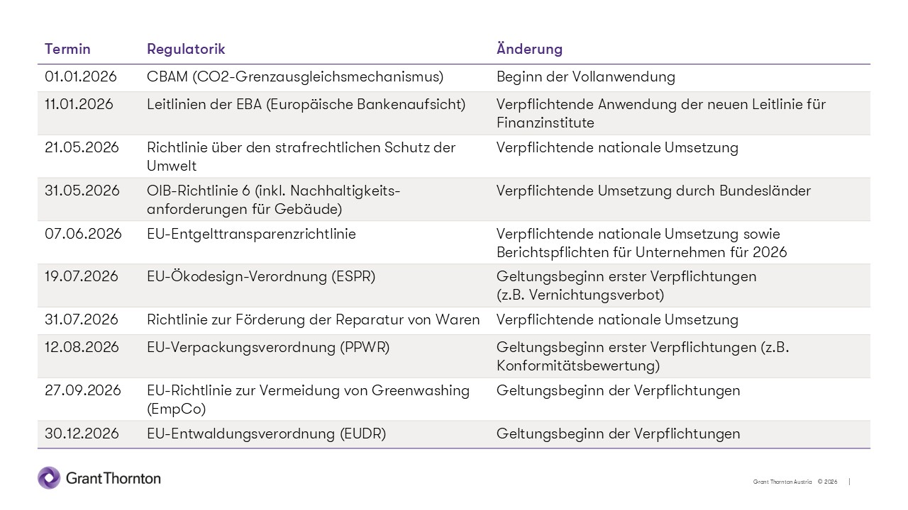 Auch wenn die nationale Umsetzung im Bundesgesetz gegen unlauteren Wettbewerb (UWG) und im Konsumentenschutzgesetz (KSchG) noch ausstehend ist, sollte davon ausgegangen werden, dass mit 27. September 2026 die Vorgaben der EU-Richtlinie „Empowering Consumers for the Green Transition“ einzuhalten sein werden. Diese reguliert Umweltaussagen durch neue Verbote und strenge Nachweispflichten umfassend. Unternehmen müssen für Umweltaussagen in der externen Kommunikation künftig belegen können, dass ökologische Behauptungen faktisch zutreffen. Bei Verstößen drohen kostenintensive Abmahnungen, Unterlassungs- und Auskunftspflichten sowie Schadenersatzforderungen. Zusätzlich ist mit gezielten NGO Kampagnen zu rechnen, die Kommunikationsschwächen öffentlichkeitswirksam aufgreifen. Unternehmen sollten deshalb Umweltaussagen in der externen Kommunikation systematisch und faktenbasiert managen. - Risiken in Operations durch neue Vorschriften für Verpackungen und Produkte sowie durch verschärftes Umweltstrafrecht